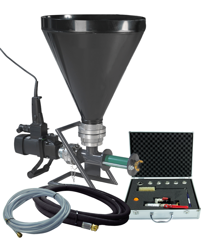 The material can be supplied via a 30 or 60 liter hopper. With corresponding accessories (spray lance, automatic gun, etc.) also suitable for spraying.