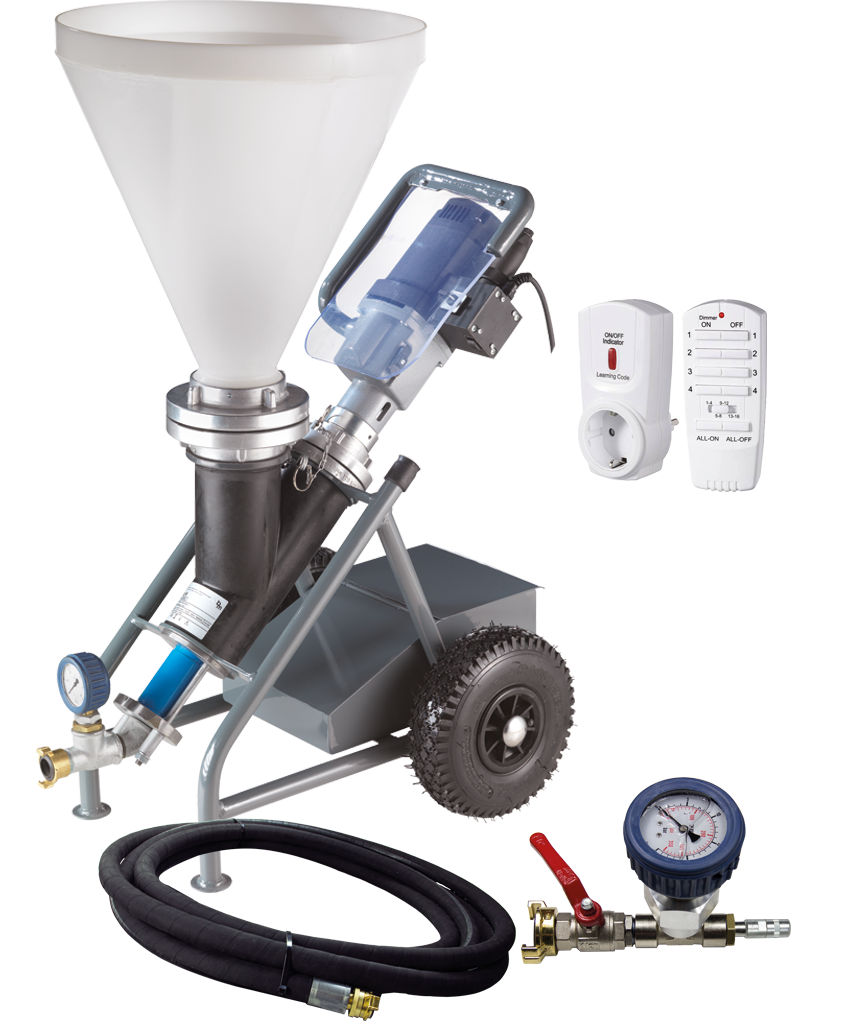 injecting or spraying a wide range or products with a grain size up to 2,0 mm such as mineral grouts, bituminous water proofing, fine plasters and renders, joint mortars,