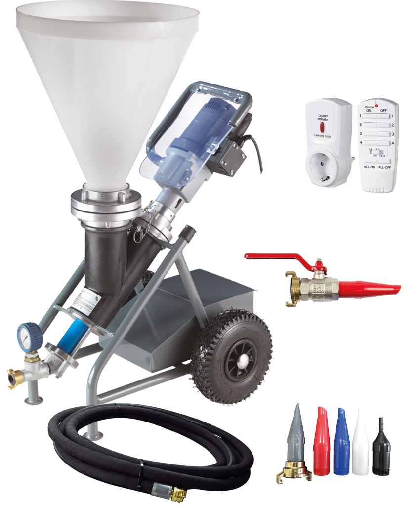 injecting or spraying a wide range or products with a grain size up to 2,0 mm such as mineral grouts, bituminous water proofing, fine plasters and renders, joint mortars,
